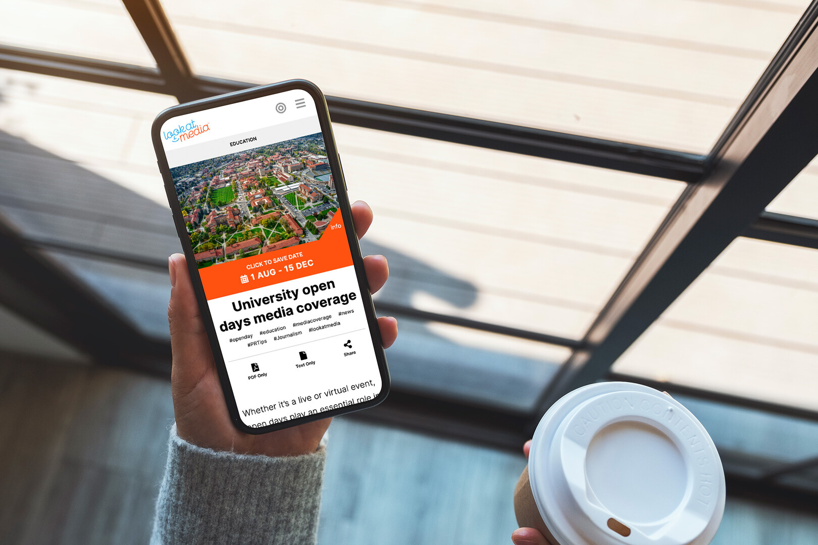 A person holds a smartphone displaying a webpage about "University open days media coverage," with a clear view of an aerial photograph of a campus. A coffee cup is visible in the other hand. The setting appears to be indoors, near large windows allo
