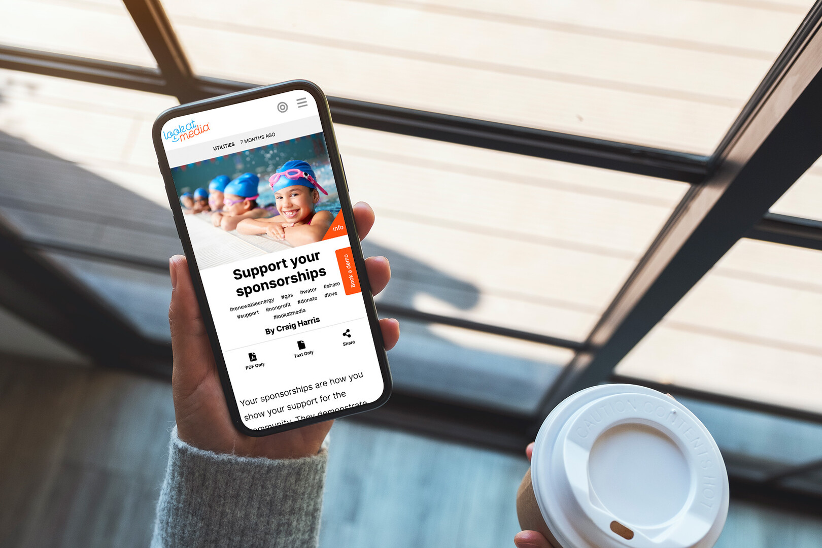 A person holds a smartphone displaying a webpage that features a group of children in swimming caps. A coffee cup with a lid rests nearby. The scene appears to be indoors near a window, with natural light illuminating the space.