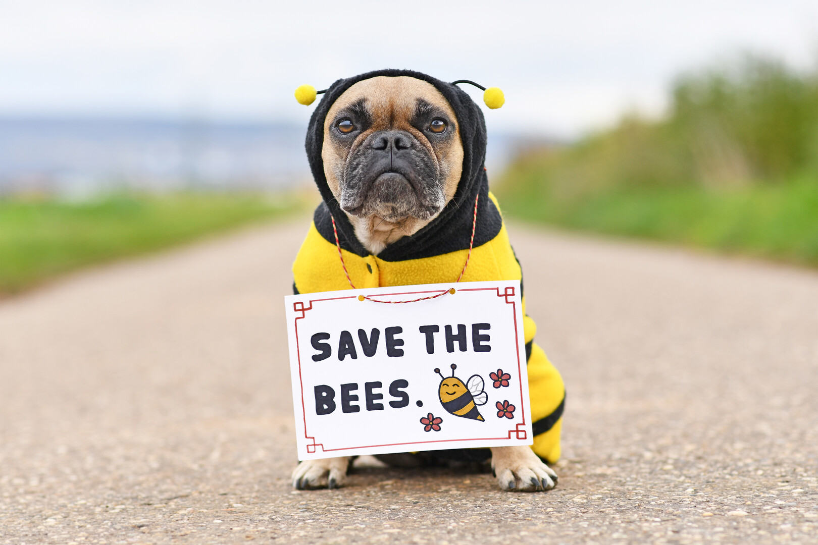 French Bulldog dog wearing bee costume with demonstration sign saying 'Save the bees'