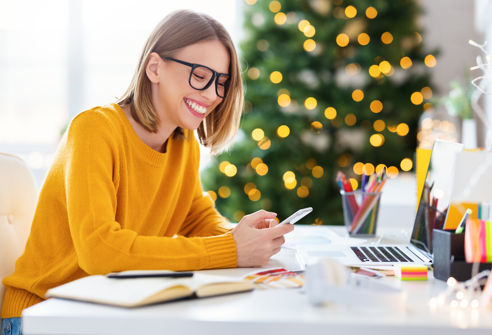 A person in a yellow sweater sits at a desk, using a smartphone while facing a laptop. A notebook and colorful sticky notes are also on the desk. In the background, a Christmas tree is adorned with lights, suggesting a festive atmosphere in a cozy in
