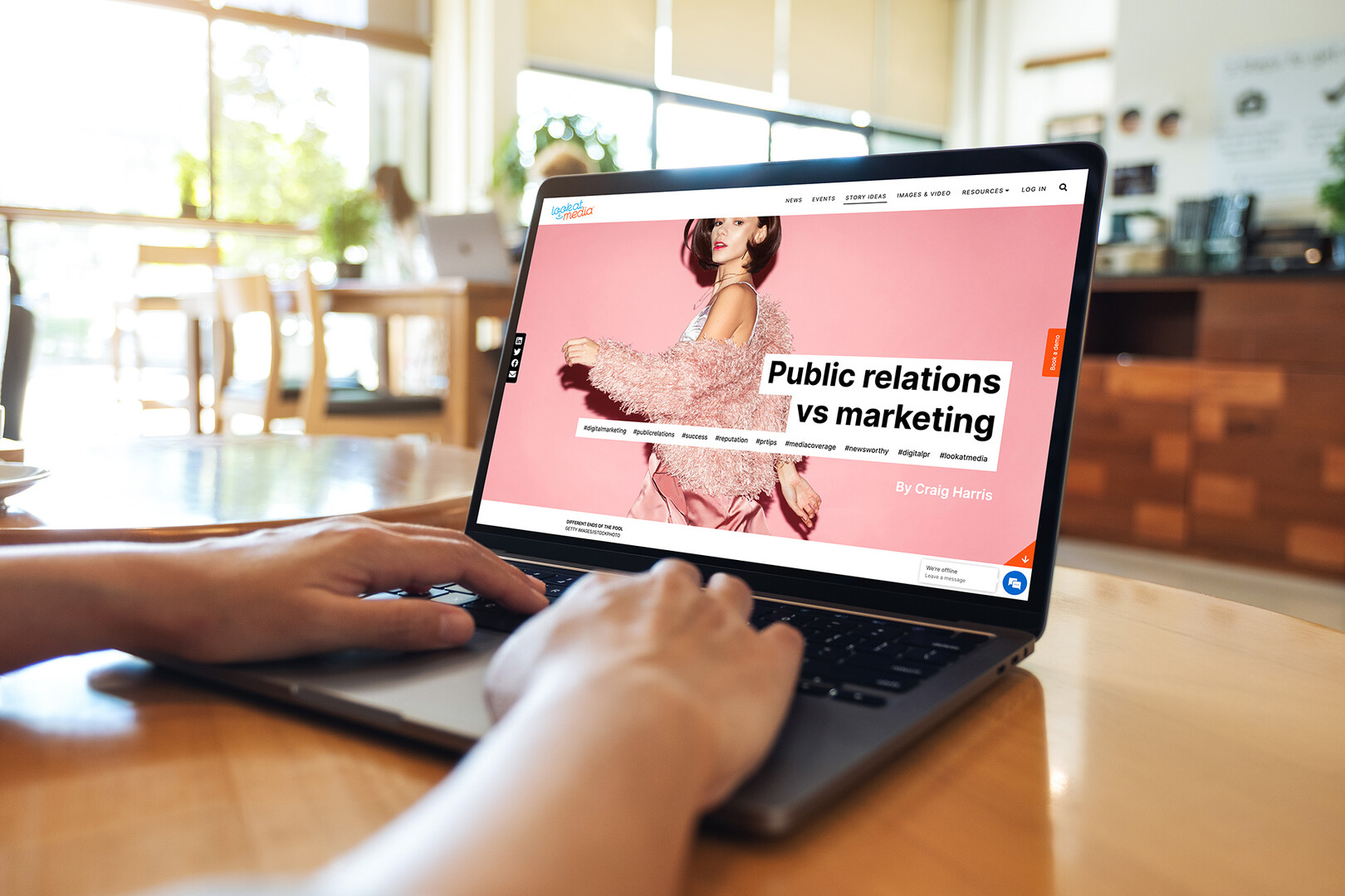A person uses a laptop at a table in a brightly lit café. The screen displays a website comparing public relations and marketing, featuring a model in a pink outfit. Soft furnishings and greenery can be seen in the background, creating a casual atmos