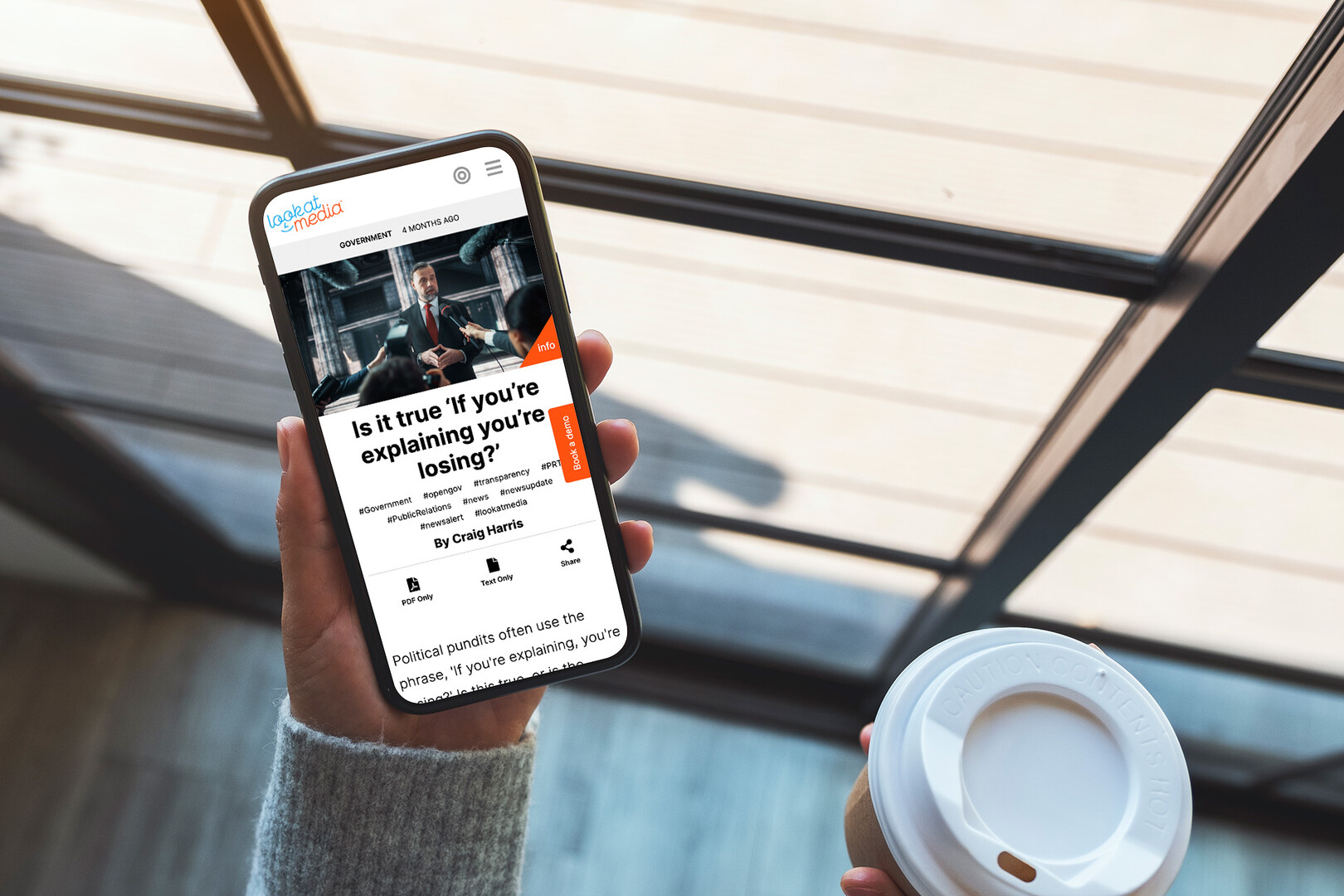 A hand holds a smartphone displaying a webpage with business-related content. A takeaway coffee cup rests on a surface nearby. The scene is set indoors, with large windows allowing natural light to enter, casting shadows on the floor.