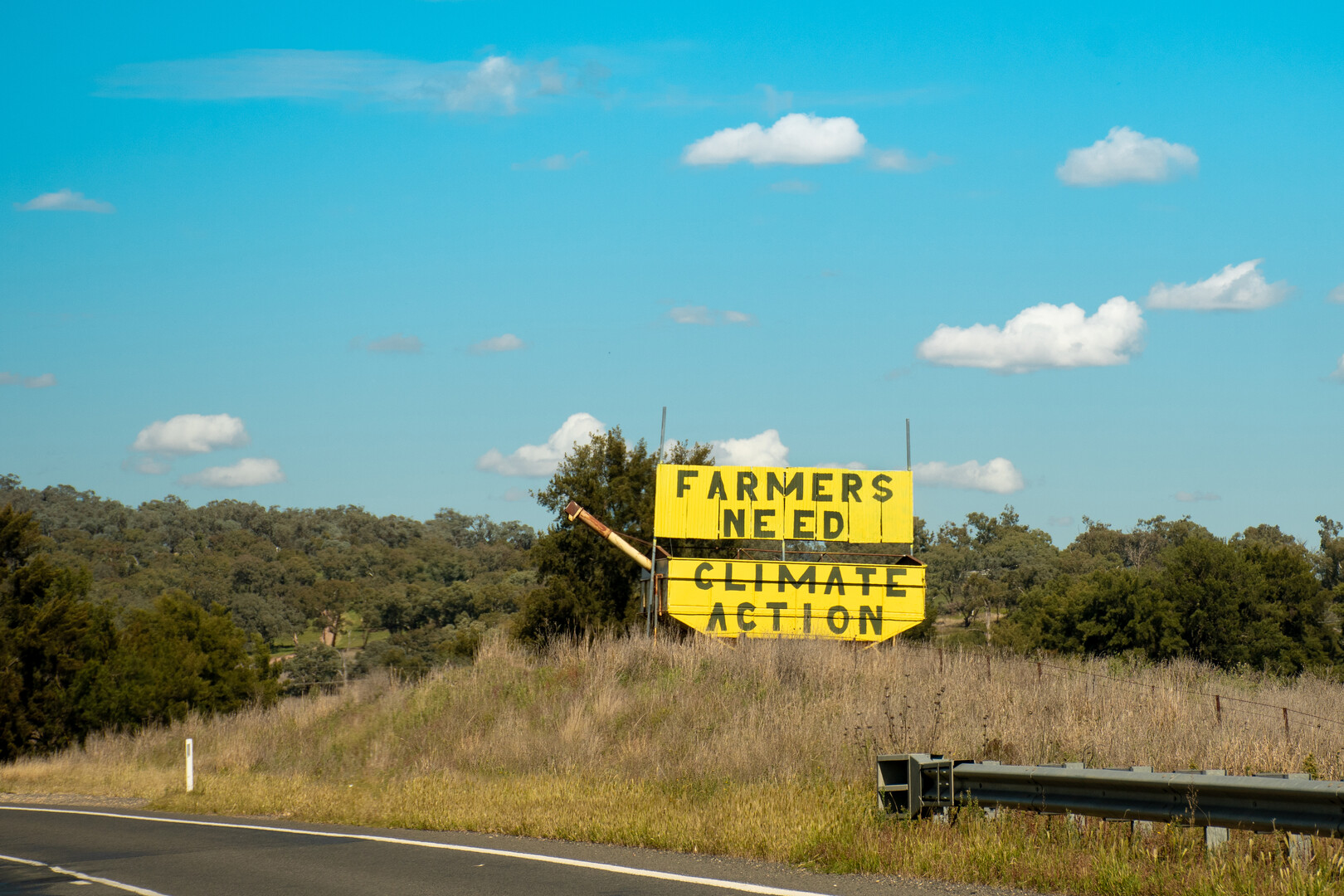 Farmers need climate action - sign on the road side in Australia. Farmers for Climate Action is a movement of more than 5000 farmers, agricultural leaders and rural Australians