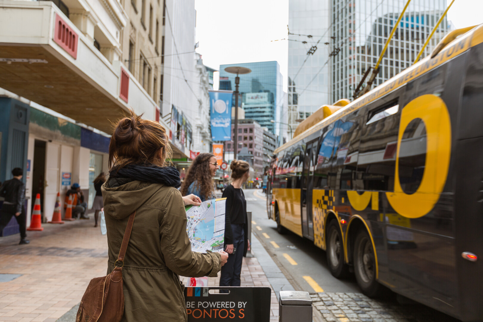 New Zealand - Septmber 3: Unidentified asian woman tourist look at the map to check the bus route while waiting for the bus on September 3, 2014 in Wellington, New Zealand. Wellington is the captital of New Zealand.