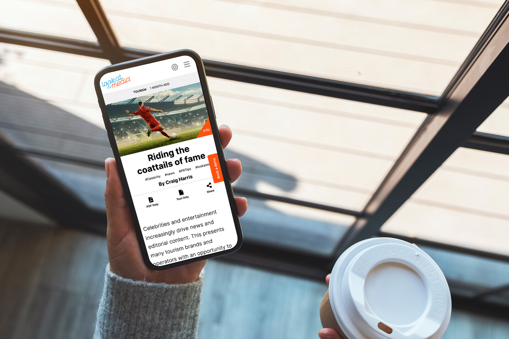 A person holds a smartphone displaying a sports article with an image of a soccer player. A takeaway coffee cup is in their other hand. The scene is set near a window, with sunlight casting shadows on the surface, suggesting an indoor environment.