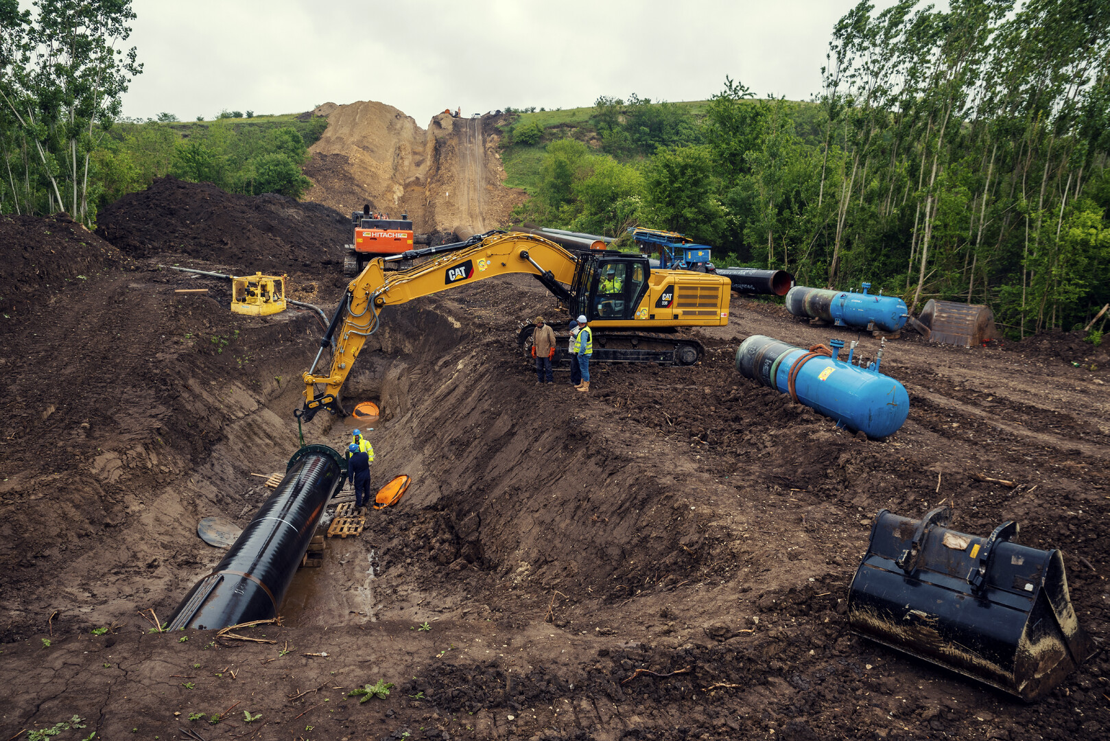 Workers operate heavy machinery at a construction site where a trench is being dug. A large excavator is positioned above a black pipe being installed into the ground, surrounded by piles of earth. Blue tanks are visible nearby, and a hilly landscape