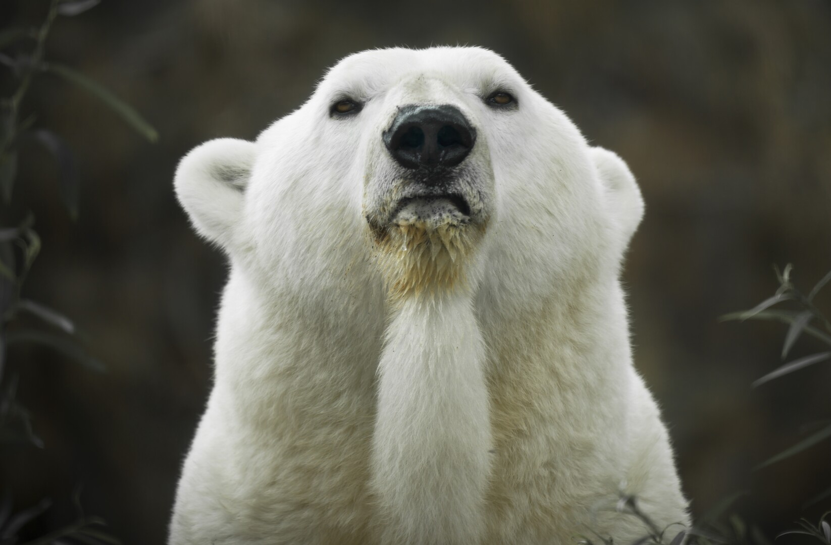 A polar bear stands close to the viewer, its white fur contrasting with a blurred background. The bear's snout is centered, with its eyes looking upward. Visible vegetation surrounds the scene, suggesting a habitat typical of colder climates. No huma