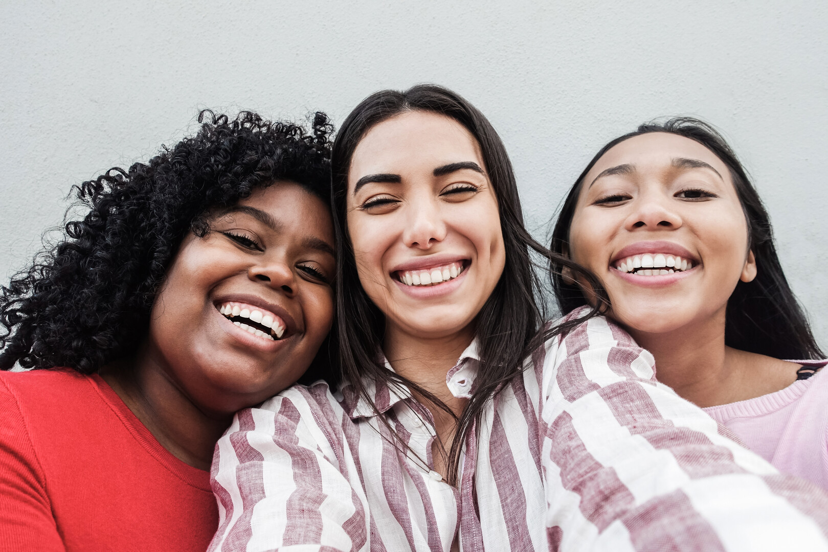 Three women pose for a selfie in front of a plain wall, with one wearing a striped shirt and the others in solid colors. The scene appears casual and friendly, with the individuals appearing to enjoy the moment together.