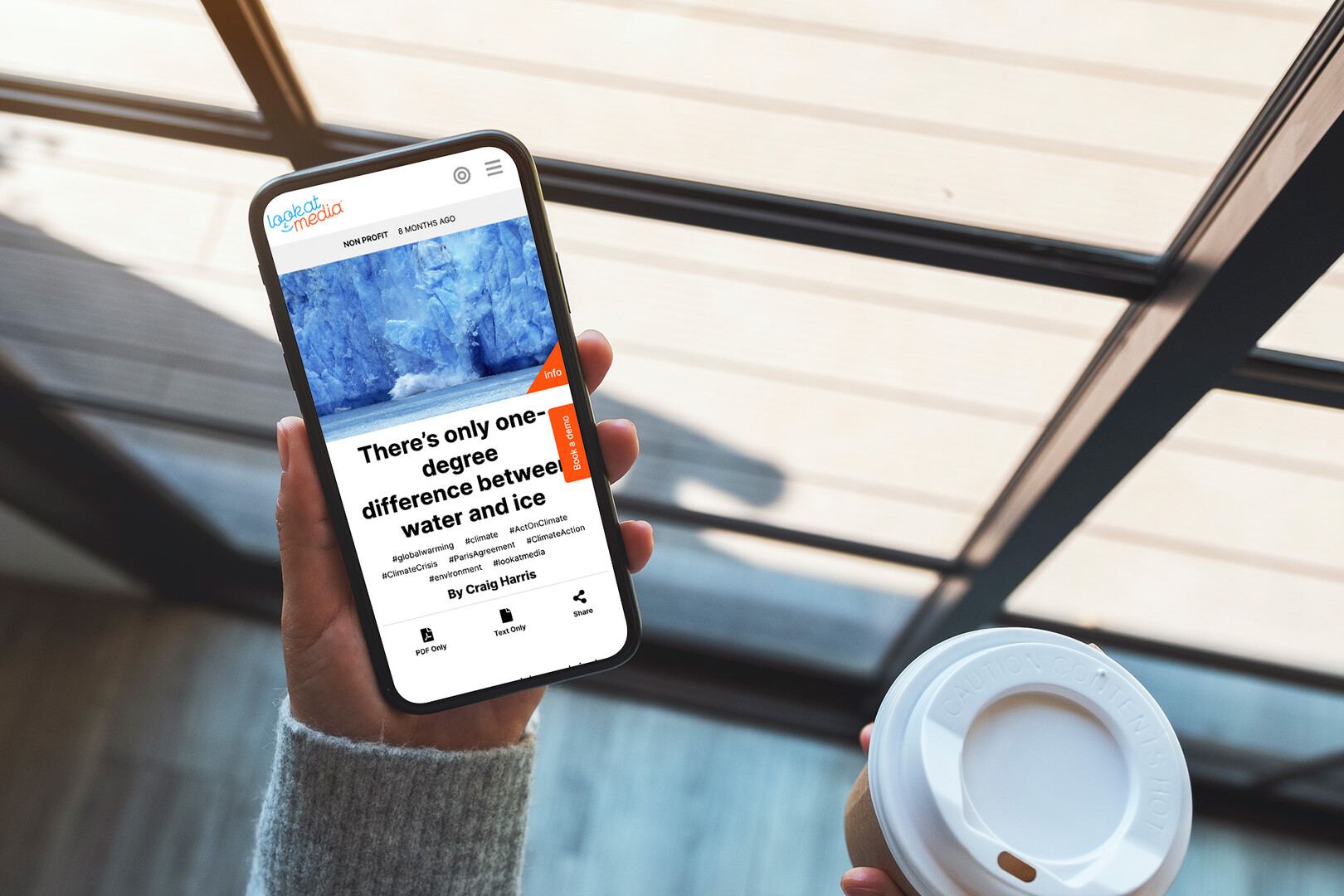 A hand holds a smartphone displaying an article about the difference between water and ice. A coffee cup with a lid rests beside the hand. The background features large glass windows, allowing natural light to fill the space, suggesting an indoor caf