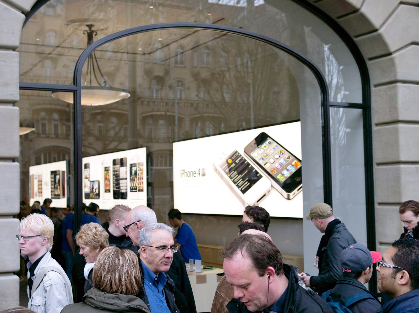 A crowd gathers outside the Apple Store in Munich, Germany, as digital screens showcase the iPhone. People are seen interacting, with some busy on their devices, highlighting the excitement around the product launch. The store's modern architecture f